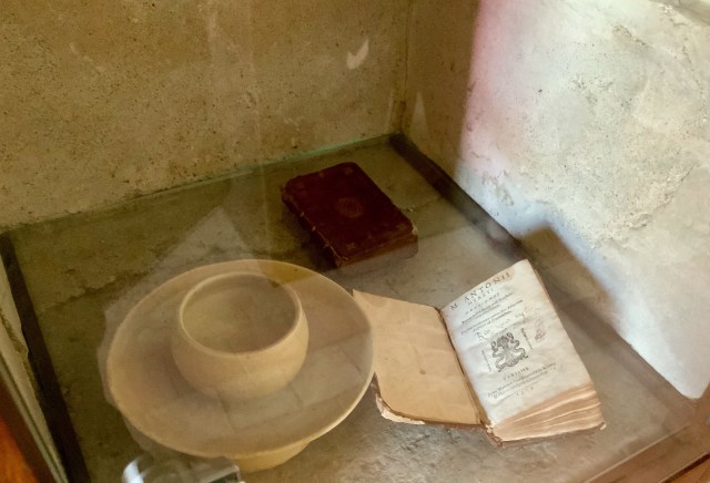 Ronsard a été prieur de St Cosme de 1565 à 1585, tout en restant laïc, et il y est enterré. On peut visiter sa maison, s’assoir dans son bureau, et se recueillir sur sa tombe, avec éventuellement une rose à la main, pour faire pédant ou romantique, ça dépend des goûts. Je précise parce qu’il a fallu expliquer à nos petits anglais pourquoi Marichéri tenait absolument à prendre en photo des roses. Et j’ai magistralement expliqué le sonnet pour MangaGirl, je ne vois pas ce qui fait dire le contraire à Marichéri. Sérieusement, c’est bien parce qu’une pouf n’a pas voulu sorti avec lui que Ronsard, un chouïa rancunier, la prévient que de tout façon, le temps passe, ma bonne dame, et qu’elle va finir toute vieille et ridée aussi, non mais. Bon d’accord, j’ai peut être résumé un peu, mais Ronsard n’a pas qu’écrit Mignonne, allons voir, heureusement! Dans le style guilleret, je préfère nettement » je n’ai plus que les os » qu’il a écrit avant de mourir. Je sens que je n’ai pas exactement fait justice au prince des poètes…