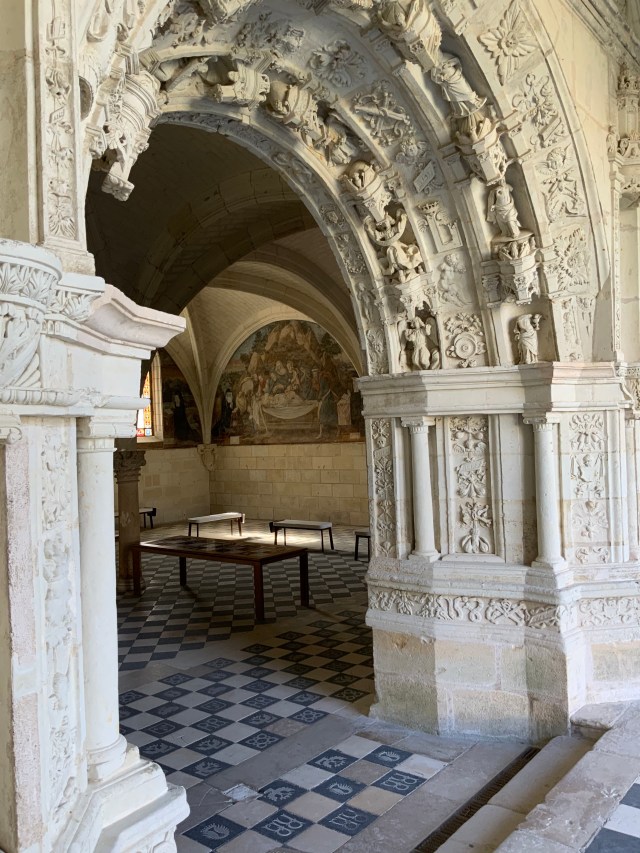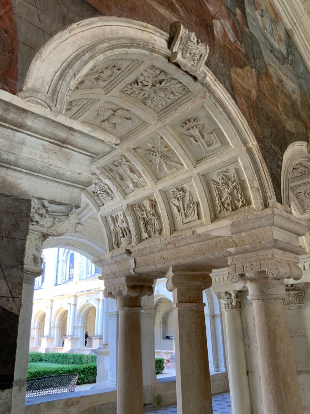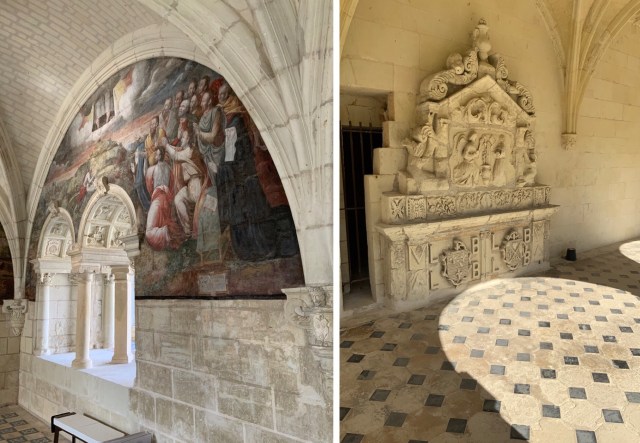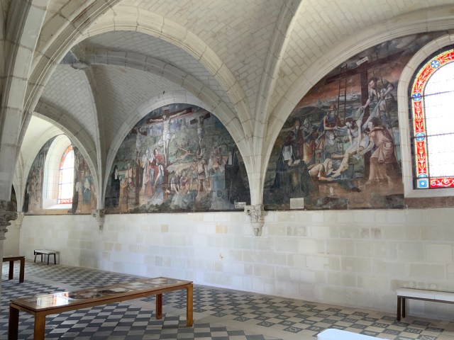 La salle capitulaire a particulièrement impressionné Wizzboy avec ses fresques de 1565 puisqu’elle lui a inspiré une réflexion artistique dubitative: « c’est bien dessiné ». C’est pas faux. Maricheri qui est un petit comique (de 6m08 quand même), a aussi fait remarque que c’était probablement les premiers photobombs de l’histoire, puisqu’on retrouve dans chaque scène l’abbesse commanditaire des fresques, Louise de Bourbon qui s’incruste de manière parfois surprenante.
