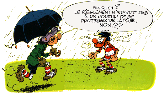 D’un autre côté, si il rattrape son retard technique (il a une façon très spéciale de défendre, basée essentiellement sur l’emploi du cri qui tue. Le pire, c’est que ça marche. Il terrorise vocalement ses petits camarades), il jouera de vrais matchs. Il faudra aller le supporter, dans tous les sens du terme. Passer des samedis dans la boue sur les touches de tous les terrains miteux du coin. Rhaaa….bon, c’est l’heure, on va au foot. Wizzboy est prêt et fait un numéro de claquette dans le couloir, avec ses crampons et Marcel qui fait l’accompagnement musical. Il faut y aller. Une heure trente à faire coucou avec un sourire crispé sur le bord du terrain. Je suis joie. Et vous allez rire, il pleut des cordes. Youpidoo.