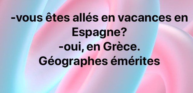 C’est génial! Ça ouvre des tas de perspectives, et pas que géographiques. Pourquoi la Grèce en Espagne? Est-ce qu’ils sont allés dans les deux pays? En même temps? Ça y est quelqu’un a découvert l’ubiquité! Ça l’intéresse vivement. Ou alors, il y a un village baptisé Grèce en Espagne? C’est original. Peut être simplement qu’il n’a pas entendu la question, mais c’est beaucoup trop terre à terre comme explication…