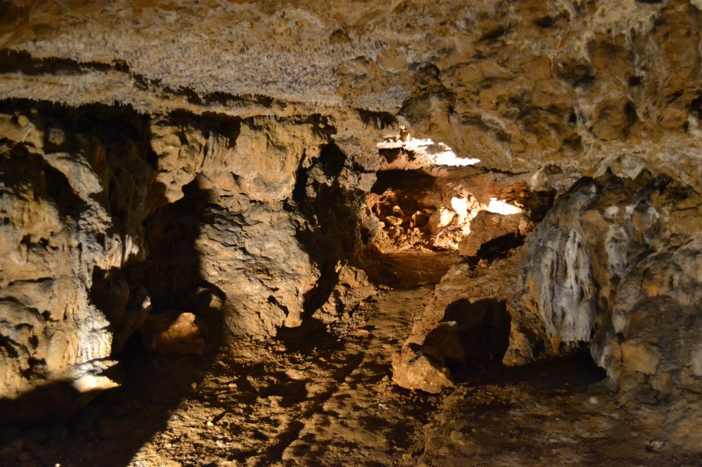 Le château est toujours habité mais on peut le visiter en été. Il présente la particularité d’avoir des souterrains caverneux taillés dans la roche pas du tout adaptés aux claustrophobe et une bibliothèque ronde absolument adorable, elle. Je ne veux pas insister, mais vraiment les souterrains ont beau avoir fait pousser des cris béats d’admiration à GeekAdo, c’est quand même très caverneux et humide. D’ailleurs, ils relient officiellement le château à une grotte juste en dessous, je vous mets une photo prise au péril de son équilibre par Marichéri (parce que c’était glissant à cause de l’humidité, évidemment, pas parce que je me cramponnais lamentablement à son mollet…)
