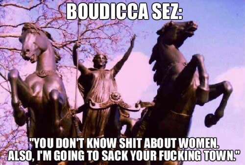 Quand les romains lui piquent son héritage après la mort de son mari, violent ses filles devant elle et la torturent, ça l’énerve. On peut la comprendre. Et hop, profitant d’une absence de la garnison, partie en promenade champêtre rasé des villages plus à l’ouest, elle incendie toute la ville, avec tous ses habitants, y compris femmes et enfants. On ne va quand même pas faire de détail. Pour certains, Boudicca est une grande patriote (alors que franchement, je suis sûre qu’elle aurait aussi bien trucidé la tribu d’à côté si ils l’avaient contrariée) ou même une icône féministe. Si. Rien de tel pour faire avancer la cause des femmes que de faire cramer quelques gamins. Du coup, les romains, vexés, se s’installent à Londres. Ils se sont aussi un tantinet vengés quand ils ont réussi à attraper Boudicca.