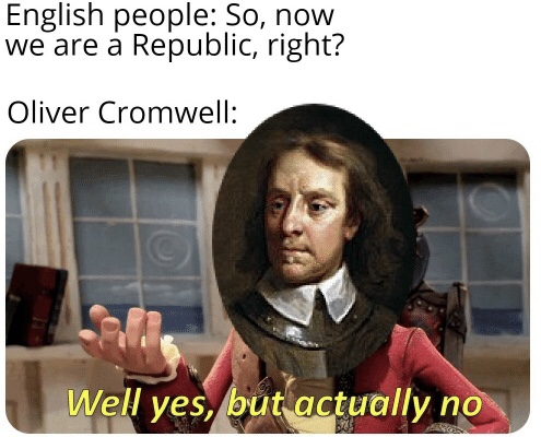 J’ai décidé, dans l’espoir de détendre l’atmosphère à ma petite échelle en cette période bizarre, de massacrer l’histoire de l’Angleterre, sans aucune compétence ni prétention autre que celle de faire rire un peu. Résumé de l’épisode précédent: avec un sens de l’anticipation et une logique pétaradante qui seront reprises des siècles plus tard par les brexiters, les députés anglais se débarrassent du roi Charles I parce qu’ils le trouvent trop autoritaire pour le remplacer par un dictateur hystérique qui s’arroge aussitôt les pleins pouvoirs. Ça s’appelle se couvrir de ridicule, comme les abrutis qui voteront pour le brexit parce qu’ils ne veulent pas je cite « que des bureaucrates non élus »les gouvernent et qui aujourd’hui se retrouvent avec Cummings, un bureaucrate non élu qui dirige le pays en « conseillant » sa marionnette Johnson. Bref, avant Cummings, les anglais ont donné le pouvoir par étourderie aussi à Cromwell, et je n’ai absolument aucune honte à faire ce genre de comparaison, au contraire. Vous avez vu la tête du conseiller spécial et celle du lord protector? C’est le même air bienveillant et amical…enfin bref, là, on va parler de Cromwell.