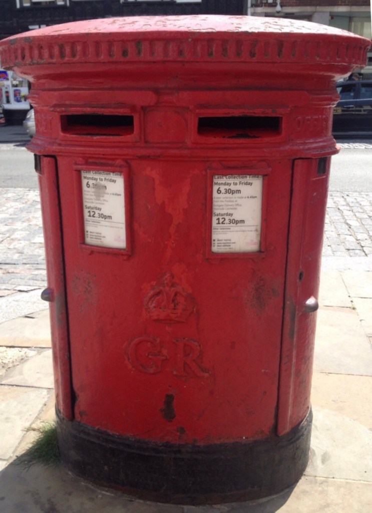 On est toujours en rouge pour le rendez-vous de Bernie, et je continue avec mon thème dans le thème. Après les bus à impériale de la semaine dernière, voici une boîte aux lettres anglaise. C’est celle de la High Street, la rue principale de Colchester où nous habitions. Elle a encore le G du roi George VI. Elle date donc du règne du père de Lizzie aussi connue sous le nom de code de EIIR (Elizabeth II Regina), puisque les boîtes aux lettres, la monnaie et les timbres portent le sigle du monarque du moment, en latin. C’est mignon, quand ce sera enfin le tour de Charles, il faudra changer pour CR, Carolus Rex.