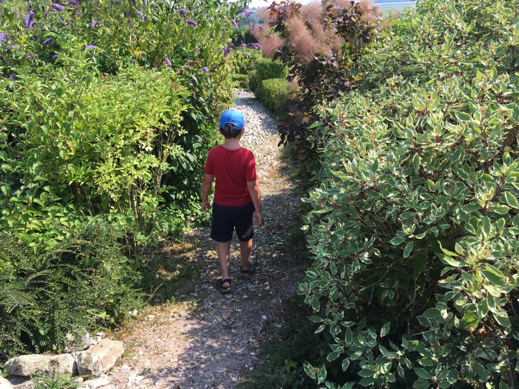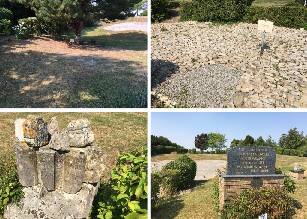 Depuis le site archéologique, aménagé en jardin, on voit le bourg actuel, en contrebas, il faut à peine quelques minutes pour monter la rue Saint Jean et accéder au plateau de l’ancienne ville. Comme ça monte quand même bien et qu’il faisait chaud, Wizzboy est persuadé d’avoir fait des kilomètres à pieds…C’est difficile d’imaginer la ville de Thérouanne au temps de sa splendeur alors qu’il n’y a que de la végétation, et pourtant, les traces sont là, dans le sol. La tâche grise en graviers par exemple, représente l’emplacement de la cathédrale. Charles Quint n’a pas fait dans le détail, il n’en reste rien. Il aurait même fait répandre du sel dans les champs autour de la ville pour rendre les terres impropres à l’agriculture, un vrai petit bisounours, ce roi, pas du tout rancunier que les français lui aient resisté. Cela dit, la promenade est charmante mais c’est émouvant de penser qu’on marche sur les traces d’une ville entièrement détruite.