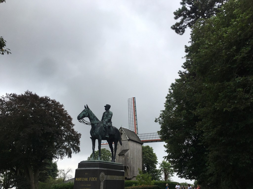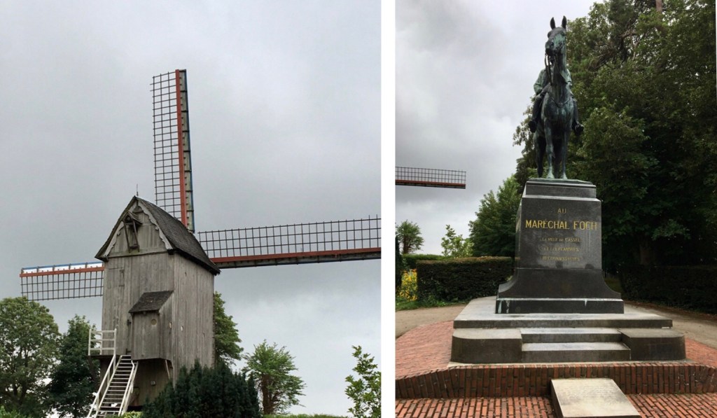 On a commencé par le sommet et le moulin accompagné par la statue de Foch, qui a marqué le village et qu’on retrouve partout. On a une superbe vue sur les nuages, la campagne flamande française.