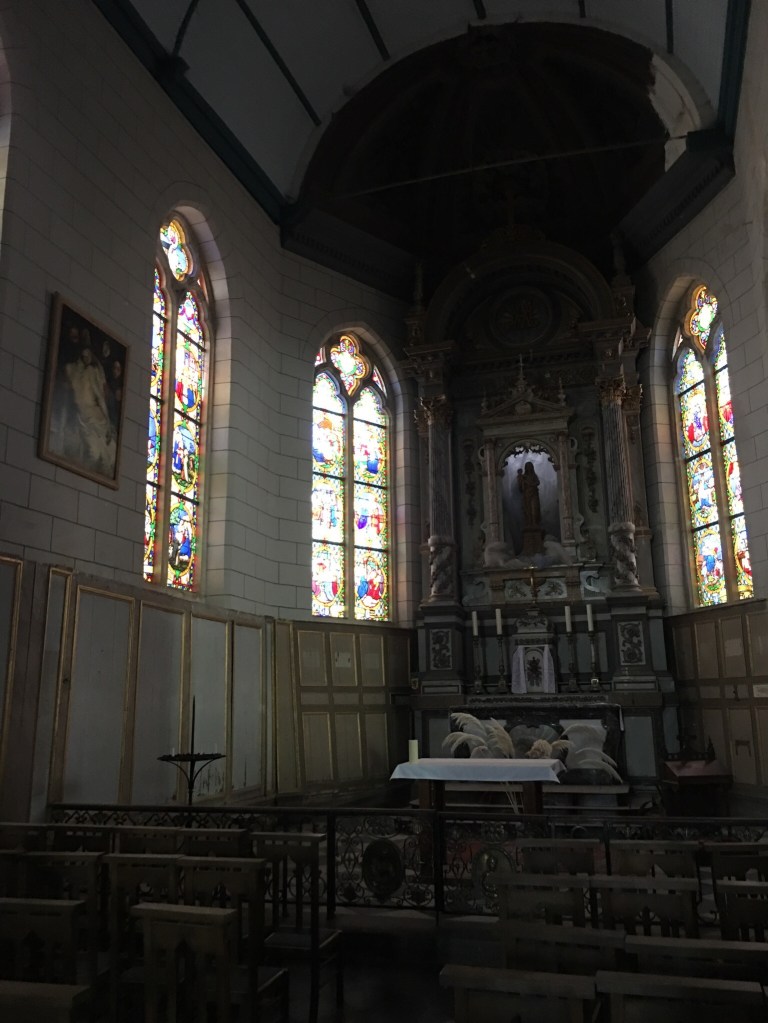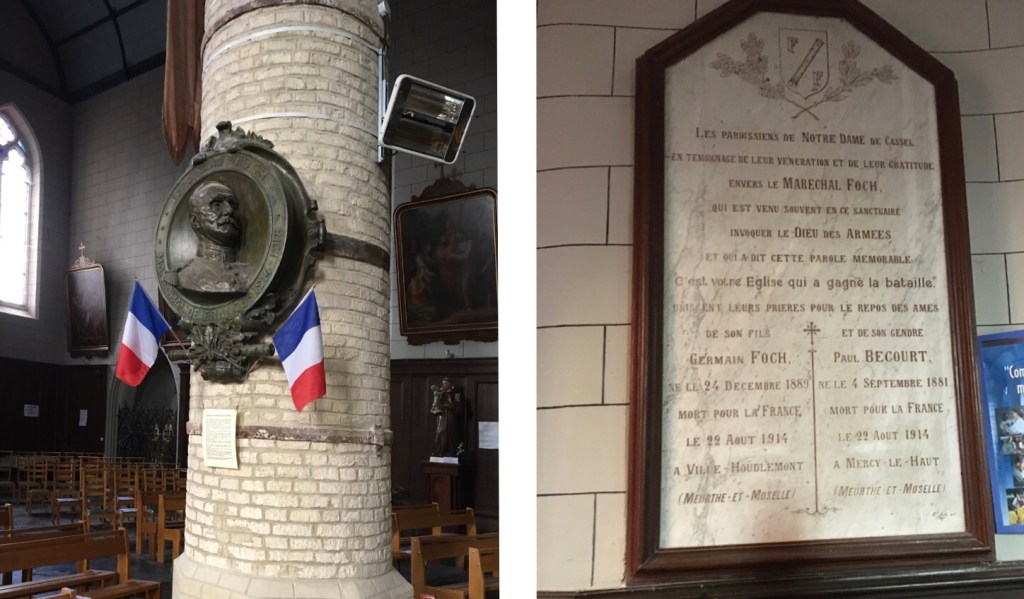 L’église de Notre Dame de la crypte est en réfection, impossible de prendre une photo correcte, sans échafaudage ou bâche de l’extérieur. Marichéri a dû se contenter de mitrailler l’intérieur. On y retrouve une plaque hommage à Foch, qui avait installé son quartier général à Cassel d’octobre 1914 à mai 1915. Après l’armistice, il est revenu plusieurs fois se recueillir à Cassel et a beaucoup marqué la population.