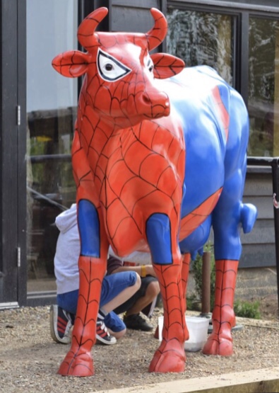 Je termine ce mois bleu et bovin (c’est mon petit twist au défi de Bernie) avec une vache qui ne m’appartient pas alors que ça irait parfaitement dans notre jardin. Si. Marichéri l’a prise en photo il y a quelques années à Jimmy’s farm, dans l’Essex. D’accord, cette vache a beaucoup de rouge, mais elle est aussi bleue et c’est clairement une super héroïne, parfaite pour clôturer ce thème. Vive Spidercow!