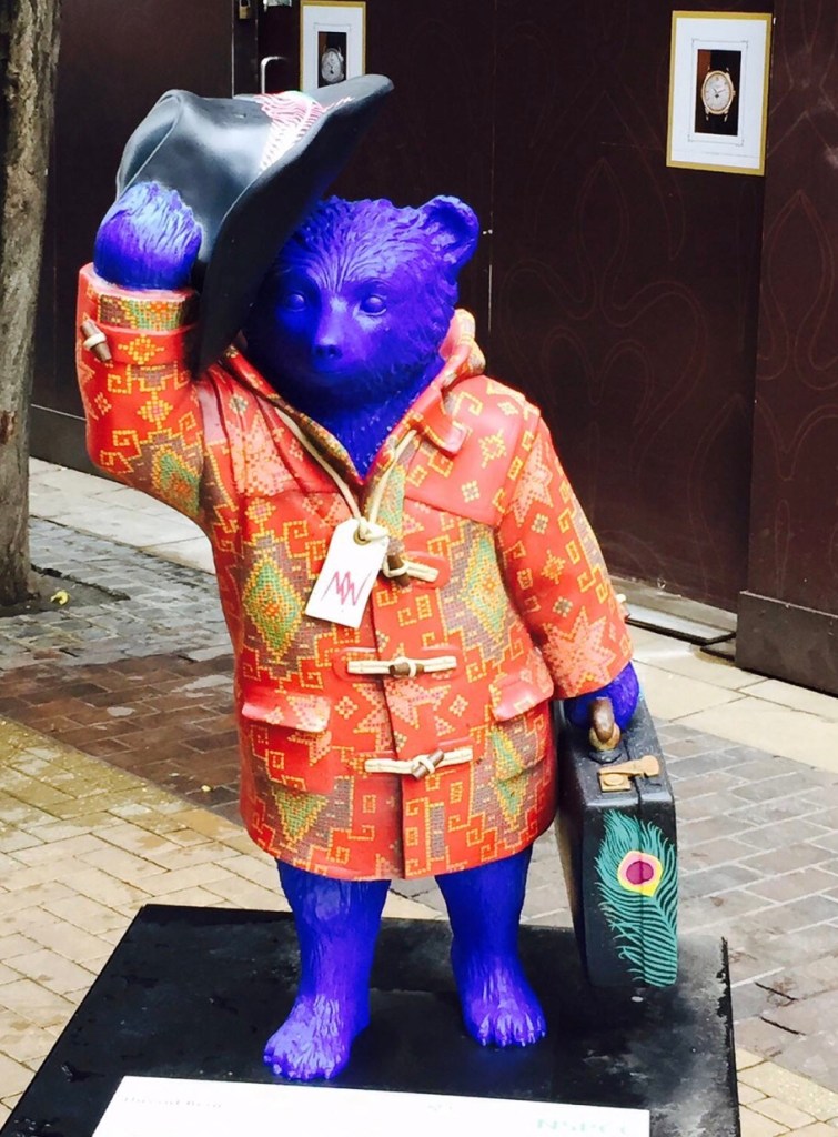 On est toujours en orange pour le défi de Bernie, et je ressors un souvenir de notre vie anglaise. Lors de la sortie du premier film de Paddington, en 2014, on trouvait des statues toutes plus délirantes les unes que les autres de l’ours Paddington dans tout Londres. Ça me plaisait déjà beaucoup, et après 2016 encore plus. Paddington Bear est un migrant débarquant de sa forêt péruvienne (Banksy l’a repris avec la légende migration is not a crime), et c’est pourtant l’un des symboles britanniques les plus reconnaissables, et toc! Et puis, il est mignon en bleu avec un duffle coat orange, non?