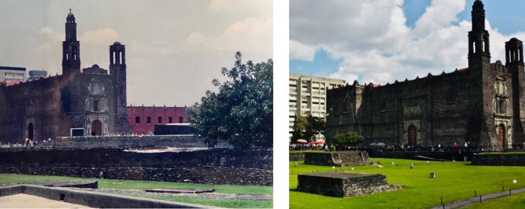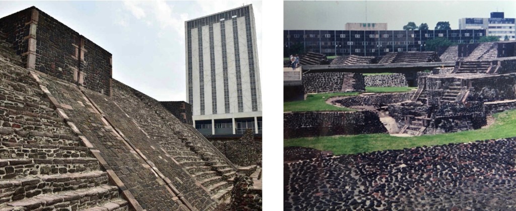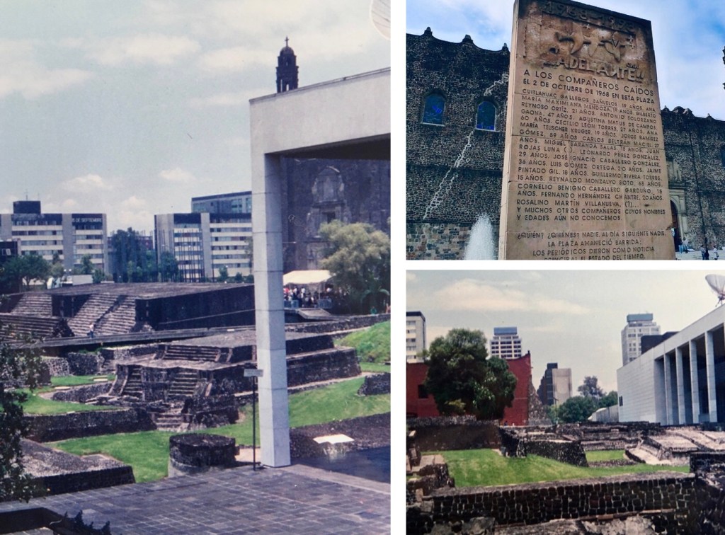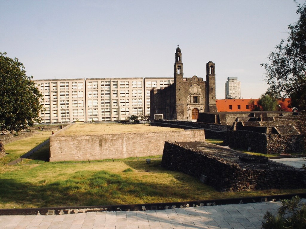 J’avais promis de varier les destinations (je pensais notamment à Washington), et pourtant je reviens encore à Mexico. Je me suis rendue compte que j’aime bien revisiter mes (vieux) souvenirs, malgré l’état de délabrement des photos, et ça plait à mes enfants! Alors je persiste, mais je vous amène ailleurs la semaine prochaine. On va donc rester à Mexico DF, districto fédéral, c’est à dire la capitale, pour un endroit très particulier: la plaza de las tres culturas, place des trois cultures, dans l’arrondissement de Cuauhtemoc, au nord de la ville. A l’échelle du gigantesque Mexico, c’est assez petit. Mais on trouve, rassemblés sur un périmètre relativement restreint, des ruines précolombiennes, une église construite par les conquistadores et des bâtiments modernes du Mexico d’aujourd’hui. D’habitude, je ne suis pas fan des mélanges, mais j’aime bien la symbolique de cette place.