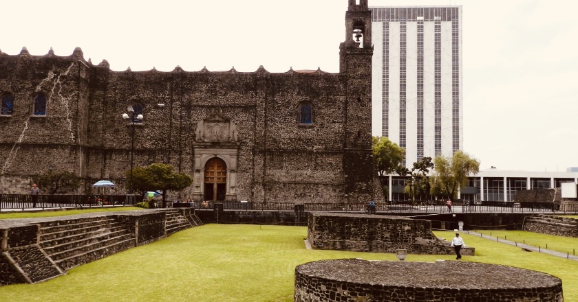 Et puis, au début des années soixante, le gouvernement mexicain décide d’y faire construire plusieurs bâtiments administratifs ultra modernes, c’est le nouveau Mexico, apaisé, indépendant, où héritages indigène et colonial se mélangent, où une nouvelle culture apparaît…mais bon, cette place à l’histoire assez sanglante, n’avait pas dit son dernier mot. C’est ici aussi que les étudiants mexicains ont manifesté le 2 octobre 1968, et qu’ils ont été chargés par l’armée qui a fait des dizaines de victimes (on m’avait dit entre 60 et 200, ça reste vague)…ce nouveau massacre a beaucoup marqué la scène culturelle mexicaine et de nombreux artistes et intellectuels (notamment Octavio Paz) y ont fait référence, plus ou moins explicitement dans leurs œuvres. Bref, la place des trois cultures, avec toutes ses symboliques différentes, est un incontournable. Sans compter que c’est quand même très joli aussi.
