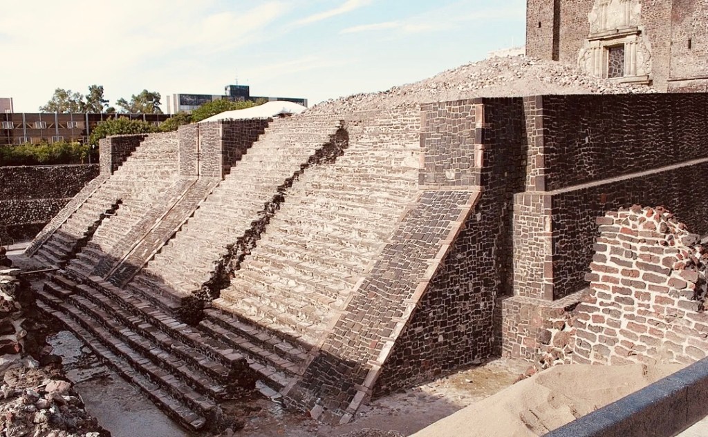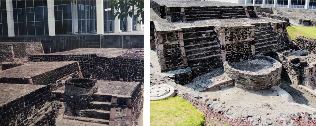 Les ruines datent du quatorzième siècle. Il y avait là une petite ville, Tlatelolco, construite en 1337 par les aztèques, en périphérie de la grande Teotihuacàn et connue pour son marché. Évidemment, il n’en reste pas grand chose aujourd’hui, et on peut se demander pourquoi de si modestes ruines sont aussi connues: et bien c’est ici précisément que Cuauhtemoc, le dernier empereur aztèque, s’était retranché et qu’il a livré et donc perdu, son ultime bataille face aux espagnols. La place des trois cultures est le dernier bastion de résistance indigène et mes collègues étaient encore fiers 500 ans après, de la bravoure de leurs ancêtres face aux colonisateurs. Cela dit, sans couloir les vexer, ils avaient autant d’ancêtres d’un côté que de l’autre…voire même plus du côté espagnol d’ailleurs. Et même européen, je pense notamment à un petit blondinet gringalet aux yeux bleus, plus pâle que moi et répondant au surprenant prénom d’adolfo…je ne veux pas m’avancer trop, mais je doute que ce pauvre garçon est eu le moindre ancêtre, aztèque ou espagnol, sur la place des trois cultures en 1521. Ni même à Mexico avant 1945, par là… Je m’éloigne du sujet. Revenons aux aztèques. Après une dernière boucherie où plus de 40000 aztèques ont été massacrés, Cuauhtemoc a capitulé à cet endroit même, le 13 août 1521…de suite, cette petite place prend toute son importance dans l’imaginaire national mexicain. On voit encore les restes du templo mayor, la grande pyramide centrale et ceux du palais de Cuauhtemoc.