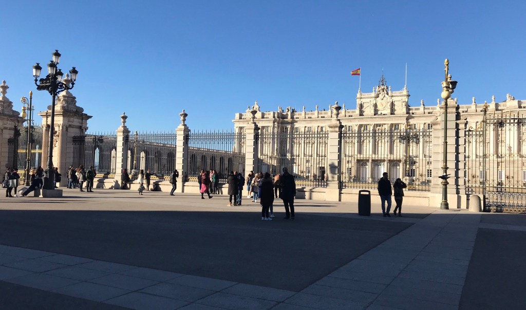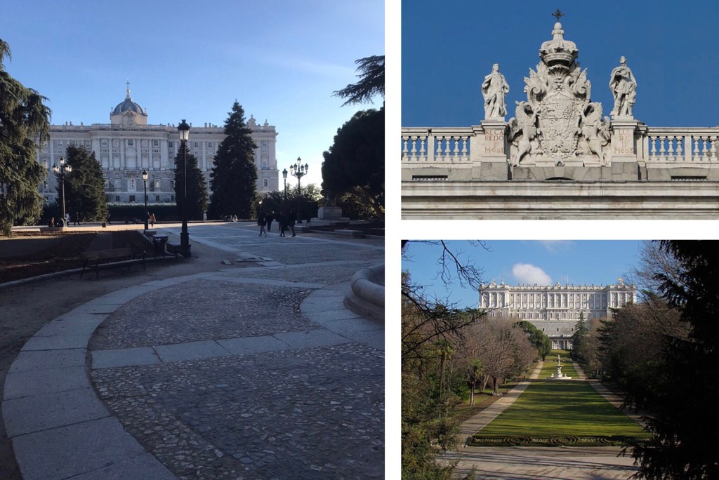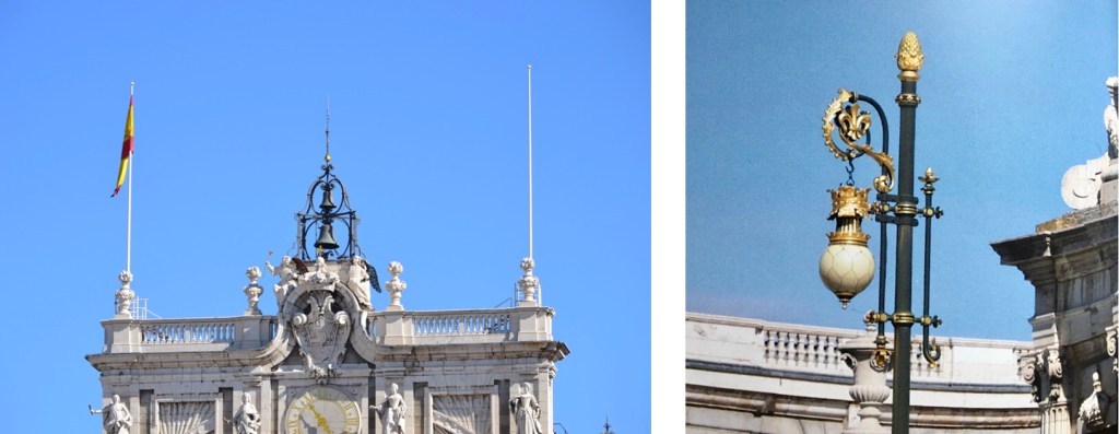 On commence par le Palais Royal, construit en 1738 sous Felipe V (sous son règne je veux dire, on n’a pas suspendu le roi en l’air pour lui construire une petite masure en dessous, un peu de sérieux!). On sent de suite que le petit Felipe avait le sens de la mesure et l’esprit guilleret, son palais en impose, alors qu’il n’a même pas pu en profiter. C’est son successeur, Carlos qui a pu inaugurer le palacio real et surtout en assurer la déco intérieure. C’est dommage. Ça se visite, avec un guide et on n’avait pas le droit de prendre de photo, mais j’avoue qu’on n’était pas trop tenté. Je ne sais pas si c’est le très relatif décalage horaire avec l’Angleterre ou l’ambiance légèrement famille Adams baroque, à coup de dorures surchargées et de lourds catafalques sombres, mais j’en garde le souvenir d’une atmosphère oppressante. On va rester à l’extérieur, sous le soleil. Il paraît que le Louvre a servi de modèle à l’architecte, c’est vrai qu’on y trouve un air de famille.