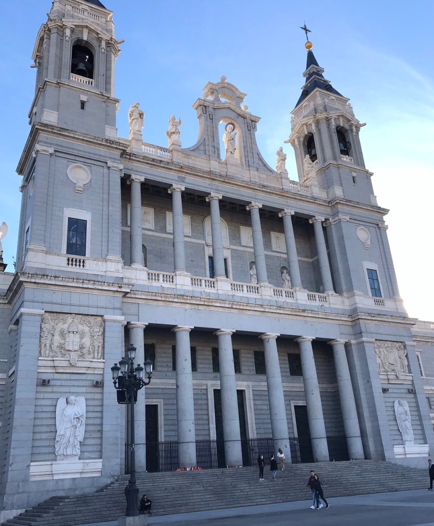 Je me décide enfin à aller voir ailleurs qu’au Mexique (mais j’y reviendrai, j’ai encore plein de vieilles photos en réserve). Pour ne pas faire un changement trop brutal, je me suis dit qu’il fallait rester hispanophone, on va donc aller se balader du côté du Palais Royal madrilène et de la cathédrale de la Almuneda à l’autre bout de l’esplanade. C’est particulièrement riant puisqu’on y trouve aussi le tribunal de l’Inquisition, juste en face du palais, sur le côté de la cathédrale…ahaha. Sérieusement, c’est impressionnant, surtout avec le bleu incroyable du ciel madrilène.
