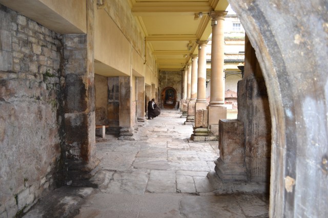 Bath doit son nom aux thermes romains magnifiquement conservés, qui datent de l’an 60 ou 70, ce n’est pas clair. Les romains étant de petits malins, ils ont remarqué qu’il y avait une source naturelle d’eau chaude et ferrugineuse (j’ai goûté, c’est répugnant). Ils ont donc construit des bains et même un temple, tant qu’à faire, autant y aller à fond. Aujourd’hui, on peut visiter le musée très bien conçu, et donc les fameux thermes y compris les salles intérieures. Les bains romains de Bath sont classés au patrimoine mondial de l’Unesco, et on comprend pourquoi. Bon, là les photos sont sombres malgré les efforts artistiques de Marichéri, il tombait des trombes d’eaux le jour où on y était, mais ça reste sublime.