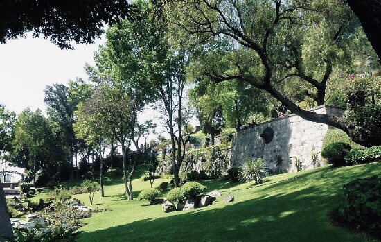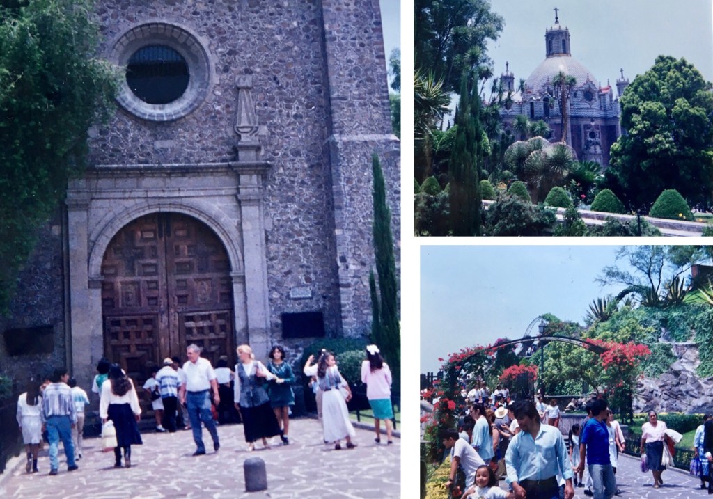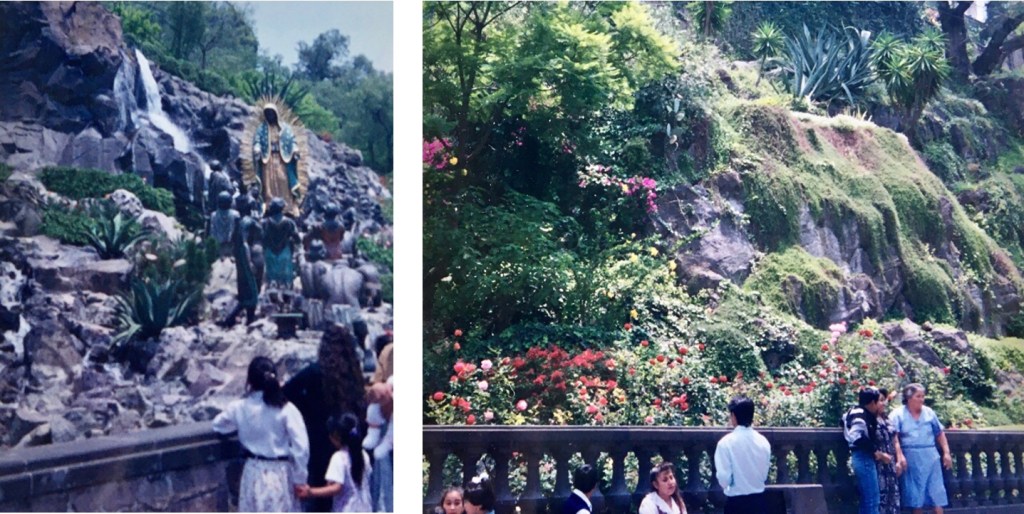 Je ressors mes vieilles photos pourries jaunies, bleuies, ou cramoisies, du Mexique, et même de Mexico DF, pour vous amener aux jardins de Guadalupe, dont le nom officiel est Jardines de Tepeyac, au nord-est de la ville. C’est agréable comme tout, grâce à une végétation luxuriante et moins bondé de monde que les rues de Mexico. Comparativement, c’est même calme, ce qui participe à son charme. D’ailleurs, on y croise essentiellement des locaux puisqu’il s’agit d’un lieu de pèlerinage. Figurez-vous qu’un paysan indien, Juan Diego de son petit nom de colonisé, est persuadé d’avoir vu apparaître juste là une vierge noire, la Virgen de Guadalupe donc, en 1535. Les conquistadores, qui évangélisaient à coup d’arquebuse dans la gueule tour de bras, se sont empressés de sauter sur l’occasion et on a construit une série de chapelles charmantes et une basilique grandiose pour célébrer la chose. Je ne sais pas ce qu’il lui a pris, à ce Juan Diego, si il voulait fayoter auprès des colons ou pas, mais il faut reconnaître que l’endroit est très agréable, on y va autant pour se promener et pour respirer un peu (Mexico est très polluée) que pour admirer la basilique.