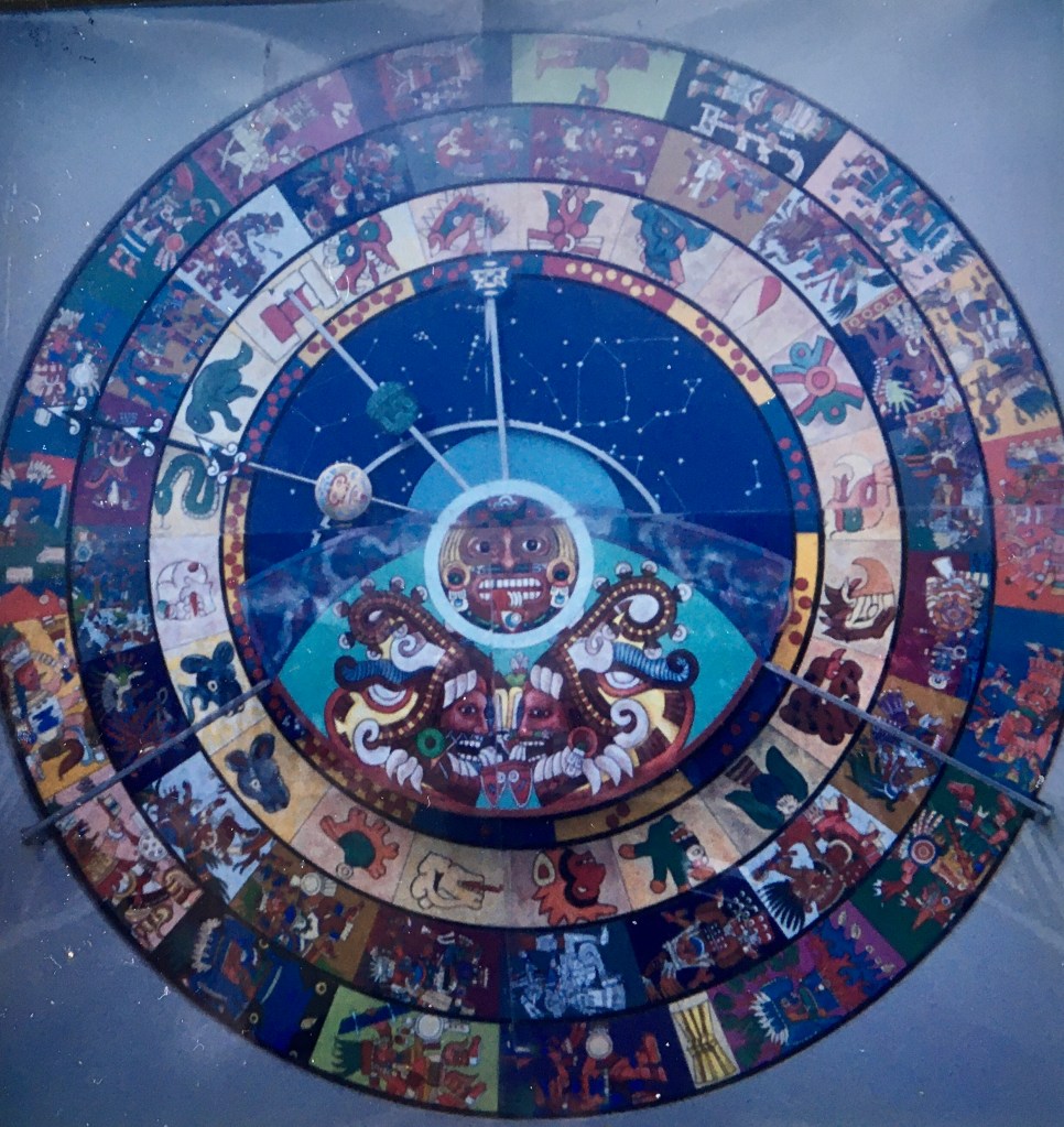 Mais n’oublions pas que Tepeyac accueillait au départ un temple en l’honneur d’une déesse aztèque, qui ressemble beaucoup, sans le manteau bleu, à la Virgen de Guadalupe, ah ben ça alors, quel heureux hasard. Les conquistadores étaient de petits malins qui ont allègrement mélangé les croyances locales au christianisme pour le faire accepter plus facilement par les indiens. C’est donc aussi dans ces jardins qu’on peut voir un magnifique calendrier aztèque, juste avant de sortir pour rejoindre le marché autour la station de métro et donc se replonger dans l’agitation de Mexico.