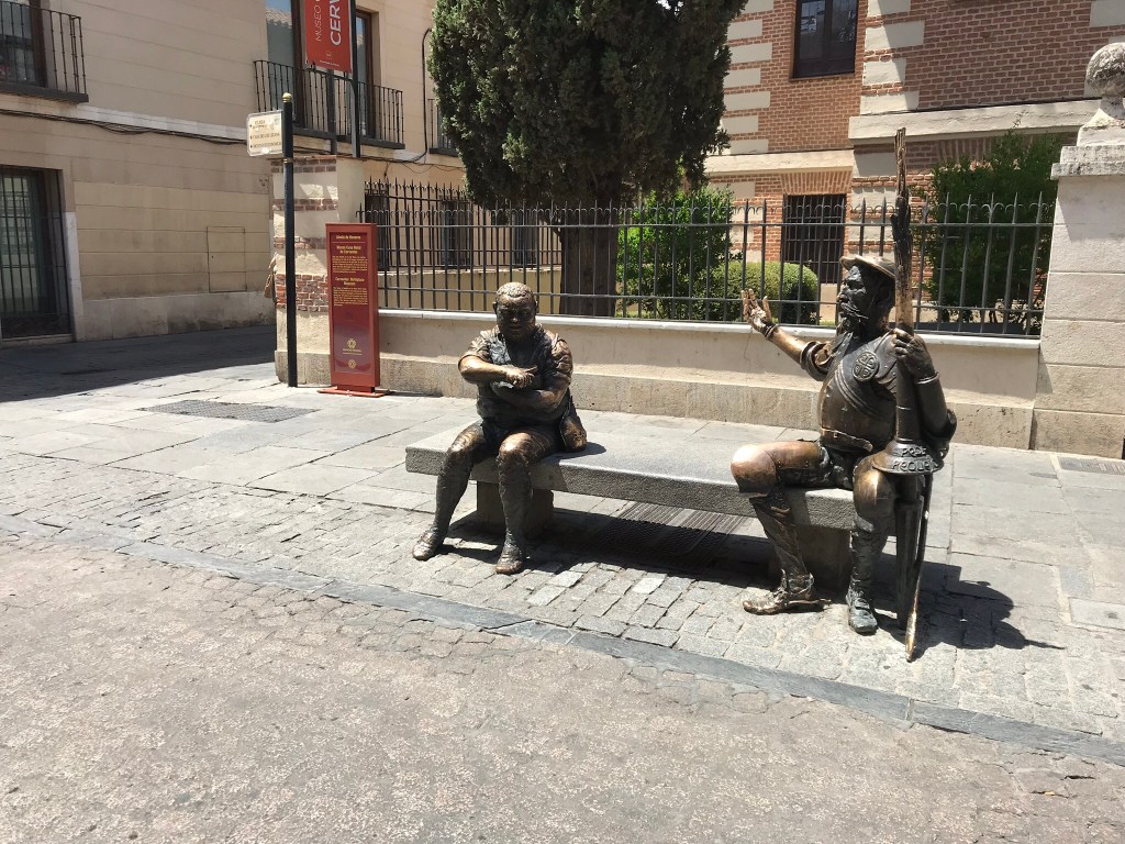 J’ai hésité pour le thème choisi cette semaine par Ma’, et c’est finalement L’Ado qui m’a donné une idée et la photo, par la même occasion. Je voulais éviter le château de conte de fée, L’Ado a trouvé! Il nous amène voir Don Quichotte et Sancho Panza en grande discussion sur un banc à Alcala de Henares près de Madrid. Il était une fois un doux rêveur…