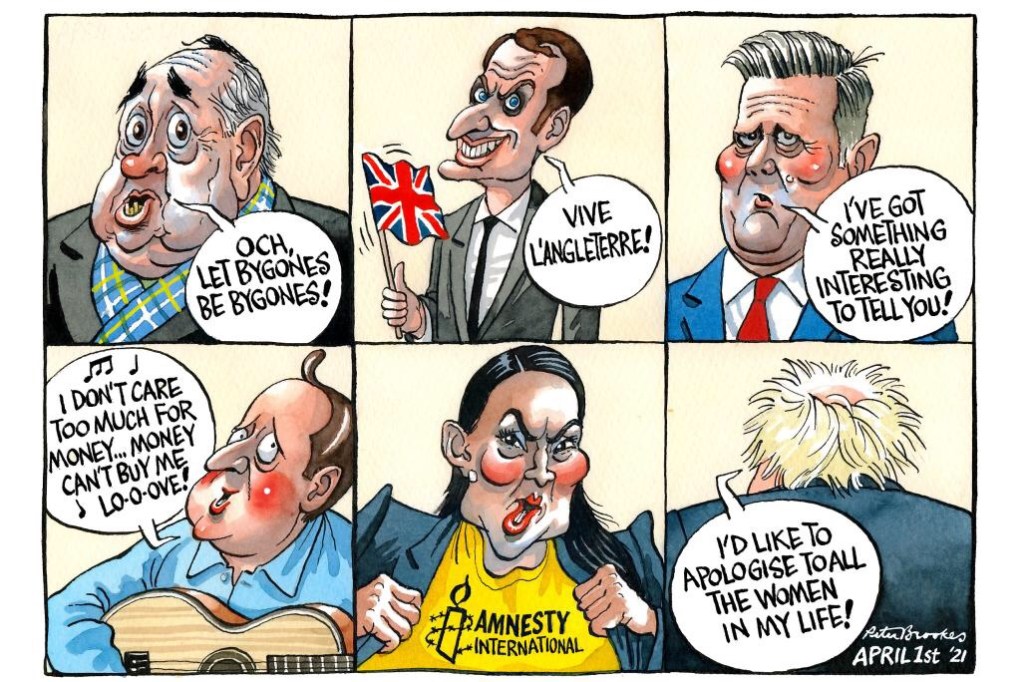 J’aime beaucoup sa façon de flatter le lectorat habituel de son journal et donc ses patrons avec les caricatures du haut, pour placer tranquillement celles du bas, qui ne sont pas exactement dans la ligne éditoriale du Times. Par ordre d’apparition sur le cartoon, on a l’ancien dirigeant écossais Salmond, (oui, il s’appelle bien monsieur Saumon(d), ce n’est pas poisson d’avril) qui navigue péniblement entre accusations de harcèlement et crise de jalousie parce qu’il a été remplacé par une femme dont il essaie par tous les moyens de ruiner la carrière, qui propose de passer à autre chose. Ahaha. Macron, que les brexiters haïssent personnellement et qui est régulièrement accusé par le Times lui-même d’être responsable de toutes les calamités qui tombent sur les anglais à cause de Johnson, qui déclare son amour à l’Angleterre, quelle bonne blague. Stamer, le leader fantomatique de l’opposition à la personnalité d’endive bouillie qui a quelque chose à dire, c’est de plus en plus drôle. Le lecteur brexiter est content, qu’est ce qu’on rit pour le premier avril. Et puis, on passe à la deuxième ligne du cartoon.