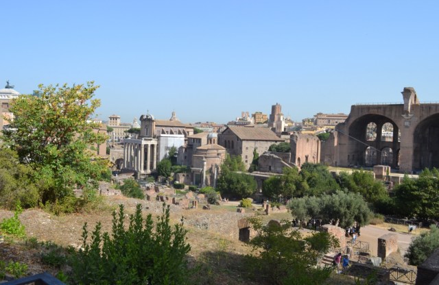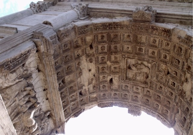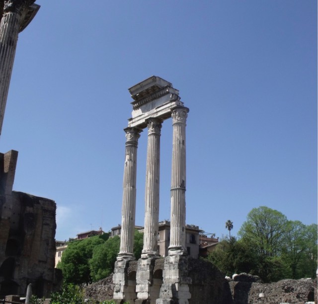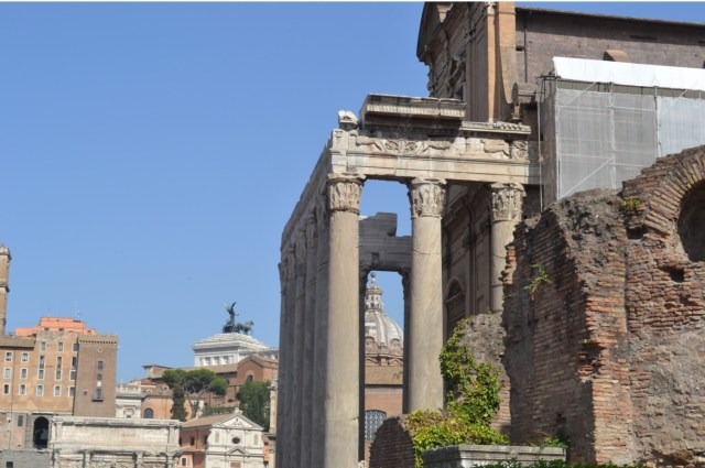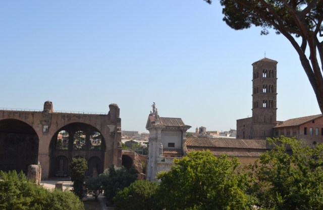 On enchaine par le forum et ses pavés glissants, même en pleine canicule. Je n’y reviendrais pas. Vraiment pas. Quand on arrive à ne pas s’étaler bêtement, s’exploser les lèvres, les genoux et les épaules (je suis très forte comme ça…), et à fendre la foule, on reste béât d’admiration. Déjà, on a une vue sublime sur la ville, en arrivant. Et forcément, on ne peut pas s’empêcher de lever les yeux sur les magnifiques colonnes des temples. Alors qu’on ferait mieux de regarder où on met les pieds, mais j’ai dit que je n’y reviendrai pas…On peut aussi admirer l’arc de triomphe de Septimii Séveri qui n’est pas un méchant dans Harry Potter mais un empereur romain du début du troisième siècle. Enfin bref, je ne vais pas recopier tout mon guide touristique, de toute façon, c’est connu et approuvé par WizzBoy, qui a trouvé ça cool bien que ce soit encore broken.