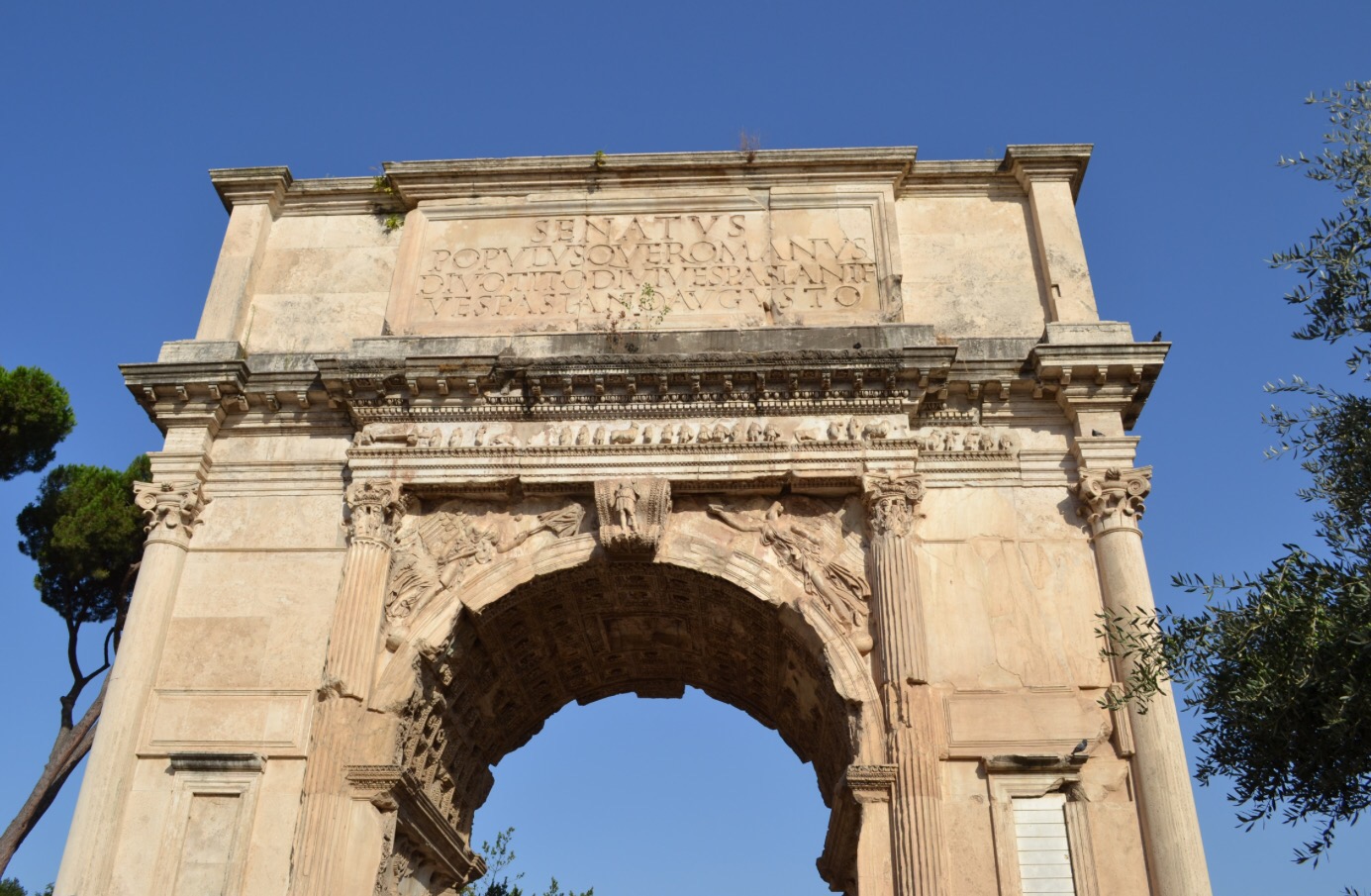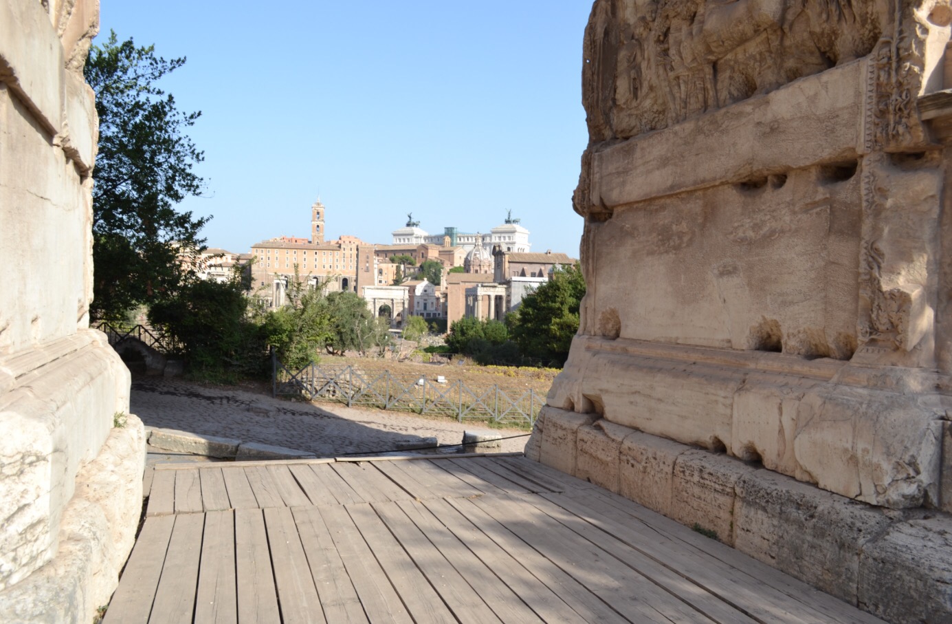 On enchaine par le forum et ses pavés glissants, même en pleine canicule. Je n’y reviendrais pas. Vraiment pas. Quand on arrive à ne pas s’étaler bêtement, s’exploser les lèvres, les genoux et les épaules (je suis très forte comme ça…), et à fendre la foule, on reste béât d’admiration. Déjà, on a une vue sublime sur la ville, en arrivant. Et forcément, on ne peut pas s’empêcher de lever les yeux sur les magnifiques colonnes des temples. Alors qu’on ferait mieux de regarder où on met les pieds, mais j’ai dit que je n’y reviendrai pas…On peut aussi admirer l’arc de triomphe de Septimii Séveri qui n’est pas un méchant dans Harry Potter mais un empereur romain du début du troisième siècle. Enfin bref, je ne vais pas recopier tout mon guide touristique, de toute façon, c’est connu et approuvé par WizzBoy, qui a trouvé ça cool bien que ce soit encore broken.