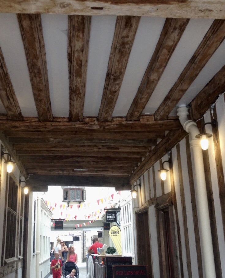 On se promène toujours dans la rue pour le défi de Bernie ce mois-ci, et je vous amène à Colchester, la capitale du borough council (un peu comme une communauté de communes) dont nous dépendions. Colchester s’enorgueillit d’être la plus vieille ville d’Anglerre, puisqu’elle a été la première capitale lorsque les romains ont colonisé le pays. Mais elle était aussi très active au moyen âge, et il en reste des traces, notamment cette rue couverte, le Lion’s Walk, bordée par des pubs bien sûr et des petites boutiques charmantes. C’était un de mes endroits préférés et j’y ai amené tous nos visiteurs de France.