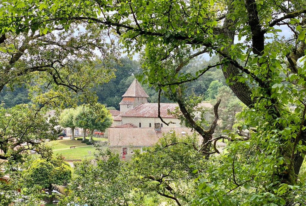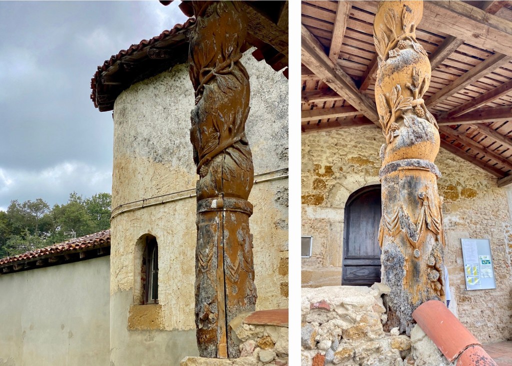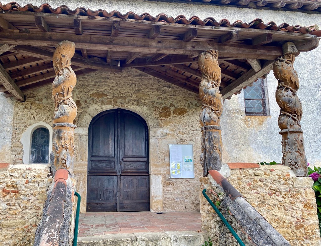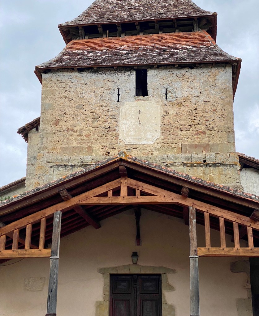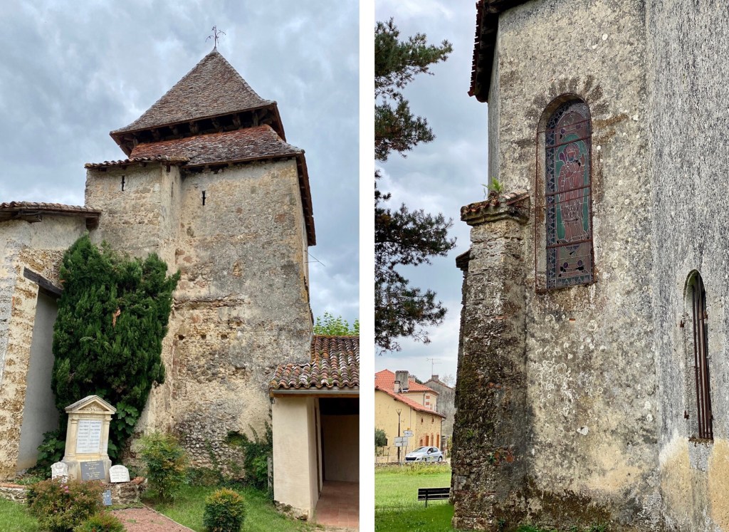 Le village en contrebas est tout petit et mignon, avec ses maisons en pierres coquillères dorées. C’est typique de la région montoise, tous les bâtiments anciens, depuis l’Antiquité jusqu’au début du vingtième, étaient construits avec. Les pierres coquillères contiennent des fossiles de coquillages et d’animaux marins datant de la période tertiaire, d’où leur nom. Mes enfants se sont extasiés en s’amusant à retrouver les traces de coquillages sur tous les bâtiments. Bougue est une étape sur le chemin de Saint Jacques et sa petite église est remarquable avec ses curieuses colonnes sculptées sous le porche latéral. Elles sont là depuis le XVIIIeme mais Saint Candide (rien que le nom est charmant ) date du XII siècle. On voit encore très bien aussi qu’ elle a été fortifiée pendant la guerre de 100 ans.