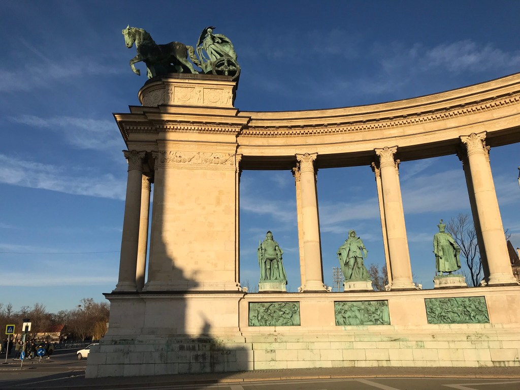 En octobre, Bernie nous propose le thème « statue ». je sens que ça va nous donner l’occasion de nous promener, j’aime beaucoup! On commence à Budapest, avec les statues des septs premiers chefs magyars qui ornent la place des héros. C’est la plus grande place de Budapest et elle a été aménagée en 1896 pour célébrer le millénaire de l’arrivée des magyars, à peu de chose près, on n’était pas à cheval sur les dates à cette époque, même si on l’était (à cheval tout court je veux dire).