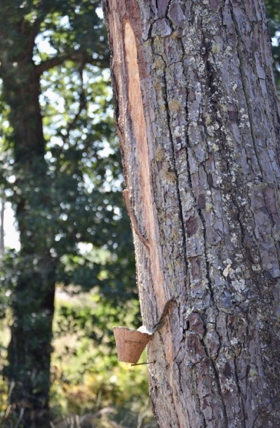 Pour ce mois de décembre, Bernie nous propose le thème « arbre ». En bonne landaise, je suis obligée, à un moment ou un autre, de mettre une photo de pin. Mais je n’ai pas choisi n’importe quelle photo. Je ne vous montre que le tronc d’un pin, mais avec son pot de gemmage. Rien qu’à voir la photo, j’ai l’impression de sentir la résine. Ce parfum très particulier a embaumé mon enfance. Les gemmeurs saignaient les pins, ils découpaient une bande d’écorce, suspendaient leur pot et attendaient que ça coule tout seul, très, très lentement et que le pin pleure quelques gouttes de résine, toute collante, toute chaude, toute odorante.