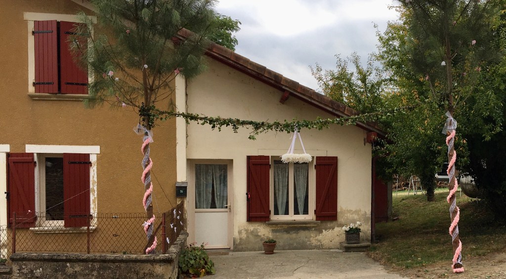 Pour illustrer le thème choisi par Ma’ cette semaine, je reprends une photo que j’avais déjà mise sur FB mais pas ici. On n’a eu chance de tomber en plein mariage traditionnel dans un village des landes cet été, et il y avait une « mayade » devant la maison des mariés. Il s’agit de pins coupés et décorés qu’on plante devant la maison de quelqu’un qu’on veut fêter ou honorer, pour un anniversaire, un départ à la retraite, un diplôme, une naissance, une promotion…et donc pour un mariage. Il y a un mai pour chacun des mariés et la couronne au milieu symbolise les noces.