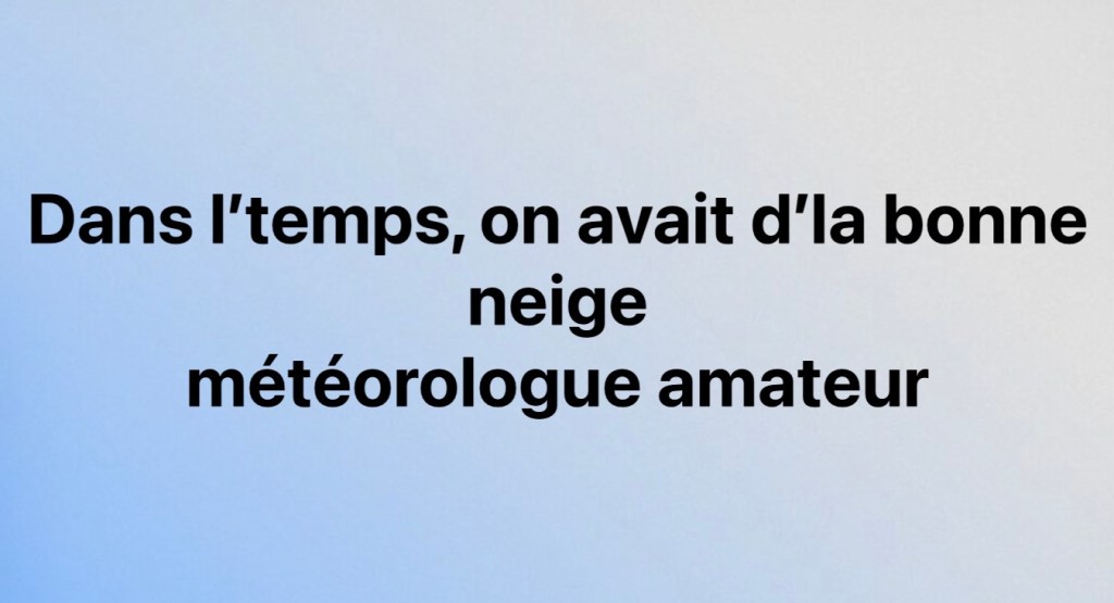 Mais maintenant, on n’en a plus. Allons bon, voilà qu’il y a de la mauvaise neige et de la bonne neige…Ça marche comment, c’est comme les chasseurs ? (Oui, j’ai des références qui datent moi aussi, arrête de te moquer, L’Ado!). On n’a pas réussi à savoir, ils finissaient de remplir leur panier et partaient, mais ils ont quand même eu le temps d’expliquer que c’est la faute à tous ces machins modernes là, les choses de l’informatique et tout ça… Wizzboy était prêt à leur expliquer le réchauffement climatique, il en a parlé à l’école, mais ils s’éloignaient déjà, bringuebalants et cramponnés à leur panier.