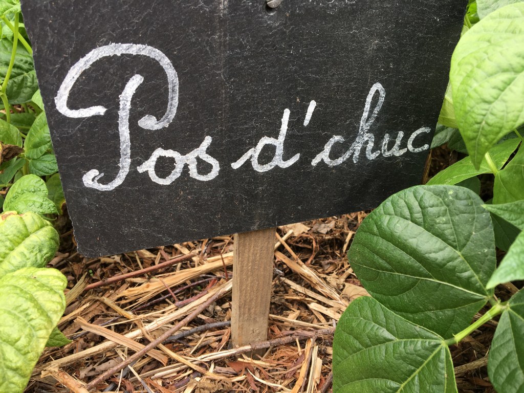 Pour le dernier lundi nordiste du défi de Bernie, j’ai choisi de terminer avec du ch’timi, ça manquait. Alors certes, je n’y comprends toujours rien et j’ai encore beaucoup de mal avec l’accent local, mais ça m’intéresse vivement. J’ai donc adoré tomber sur des petits ardoises avec les noms Chti des plantations dans un potager de l’éco musée. Après enquête, il semblerait que les pos d’chuc soient des haricots vert.
