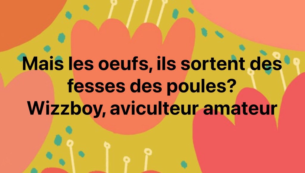 Il est horrifié. Mais c’est tous les œufs comme ça, même ceux du marché? Eh ben, on fait ce qu’on veut avec nos poules, mais c’est décidé, il ne mangera plus jamais d’œufs. Qu’est ce que c’est que ces histoires?!? et pour les gâteaux? Uh? Il y a des œufs dans mes gâteaux…ah. Ça mérite réflexion. Mais quand même, on mange des trucs qui sortent des fesses d’une poule, on se rend compte un peu?