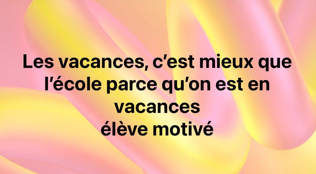 Non seulement cet enfant est parfaitement logique (pendant les vacances, on est bien en vacances), mais il a aussi réussi à résumer en une seule phrase l’état d’esprit de toute une cour de récréation. C’est admirable. Et je suis entièrement d’accord avec lui, les vacances, c’est mieux.