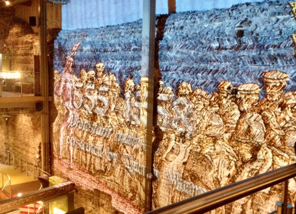 Décidément, ça fait deux fois que je pense directement à une photo précise en découvrant le thème donné par Ma’. Je vous amène à Colchester, la «grande » ville de notre ancien borough council et surtout, l’ancienne capitale de l’Angleterre romaine. J’ai parlé plusieurs fois de l’histoire de Colchester, qui est donc très fière d’être la plus ancienne ville anglaise. On trouve des vestiges romains partout, mais aussi saxons et normands. D’ailleurs, les normands ne se sont pas gênés et ils ont construit leur forteresse au onzième siècle directement sur les restes du temple de Claudius. C’est aujourd’hui un musée très bien fait où l’on raconte l’histoire de la ville en images, directement projetées sur la muraille, c’est là que je voulais en venir depuis le début. Je trouve que c’est une jolie façon de raconter.