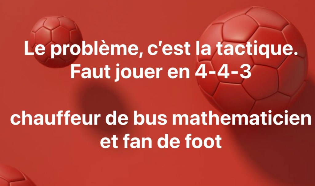 Alors donc, en rajoutant le gardien qui n’est jamais compté dans de genre de composition tactique, ça fait 12 joueurs. Eh bien, il a raison, ce chauffeur de bus supporter, ça se tente! Vu le niveau catastrophique de l’équipe de France, un joueur de champ en plus par rapport à l’adversaire, ça ne peut pas faire de mal. Déjà, ça prendra plus de place…ou alors, le chauffeur compte bien 11 joueurs, c’est juste qu’il ne met pas de gardien. C’est pas idiot non plus, quitte à prendre des buts, autant avoir une bonne excuse. Bref, ce monsieur a de très bonnes idées, je me demande pourquoi la federation de foot ne l’appelle pas.