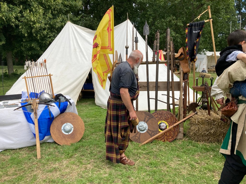 On a rencontré des écossais lors d’une reconstruction médiévale. GeekAdo était en transe: ça lui rappelle « toute son enfance » et nos sorties aux reenactments anglais. Wizzboy a adoré aussi bien sûr, il a même pu faire une initiation aux combats de chevaliers. On s’est d’abord demandé si c’était une bonne idée, de lui apprendre à se servir d’objets contondants (parce que bon, une épée en bois, ça coupe très peu mais ça peut assommer), mais il est tellement peu manuel qu’on a vite été rassuré.