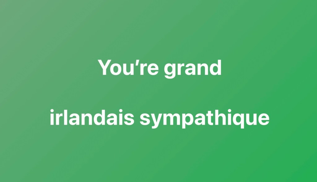 Et Marichéri et moi étions ravis. Ça, c’est l’Irlande! On ne dit pas « you’re fine », comme le premier anglais venu, mais « grand » qui se prononce «grant » pour une raison inconnue. J’étais tellement contente que j’ai lancé un tonitruant « bye now » en guise d’au revoir. Ça ne passerait pas du tout en Angleterre, mais à Dublin, c’est normal puisque c’est la traduction littérale de la formule en gaélique.