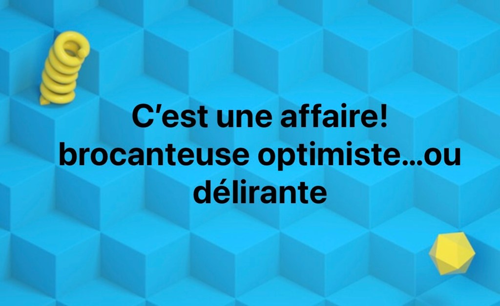 Le week end dernier, pour une raison qui m’échappe, Marichéri m’a traînée dans une sorte de sous vide grenier. Soyons clairs, autant j’adore les vraies brocantes, autant là, je ne vois pas…j’arrive pourtant à m’extasier sur une vieille gouttière cabossée qui ferait un très joli porte parapluie, une chaise louis Philippe éventrée à trois pattes ou une ancienne porte cassée et irrécupérable mais qui a une jolie poignée. Mais là, j’étais juste éberluée par l’état de ce que les gens osent vendre. Maricheri a bien ri devant ma tête effarée, quand on a entendu une dame tres motivée qui essayait d’appâter le client: