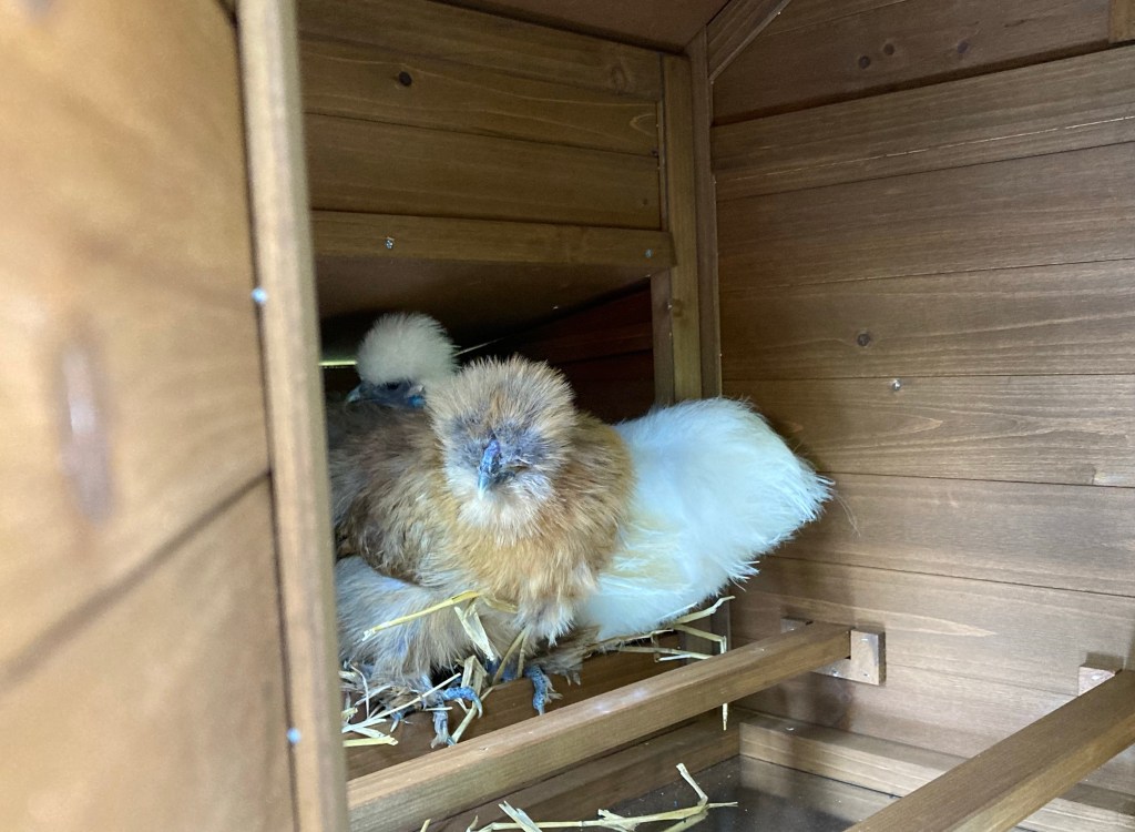 Gladys et Milicent sont raisonnables : Bertille et Alphonsine trouvent que c’est très amusant de passer la journée dehors sous la pluie, j’ai donc des poules mouillées. Bertille a éternué deux fois hier ! Et je me suis étalée dans la boue en allant fermer le poulailler.