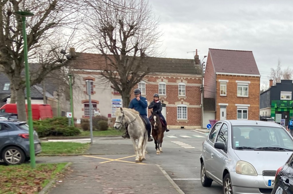 Cette semaine de rentrée sous une pluie incessante n’a pas été folichonne, du coup, j’ai bien apprécié la surprise de croiser des cavaliers en allant au marché.