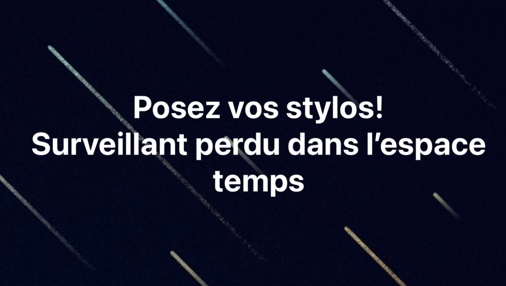 Ça a fait sourire. Est-ce que le surveillant est un voyageur temporel, qui est déjà rendu 4 heures plus loin que le reste de la salle? Est-ce que lui peut écrire par transmission de pensée er n’a pas besoin de stylo? En tout cas, ça a donné un petit air de mystère à une bête épreuve de HLP (pour ceux qui n’ont pas suivi la réforme, j’insiste mais vous n’imaginez même pas la chance que vous avez, et sinon, ça veut dire humanité, littérature et philosophie, rien que ça). Mangagirl s’est un peu détendue, et elle a bien pris son stylo. Après coup, elle s’est demandée si le surveillant avait fait exprès, pour les faire rire. Je pense plutôt qu’il est déjà épuisé par anticipation. On en revient au trou dans l’espace temps.