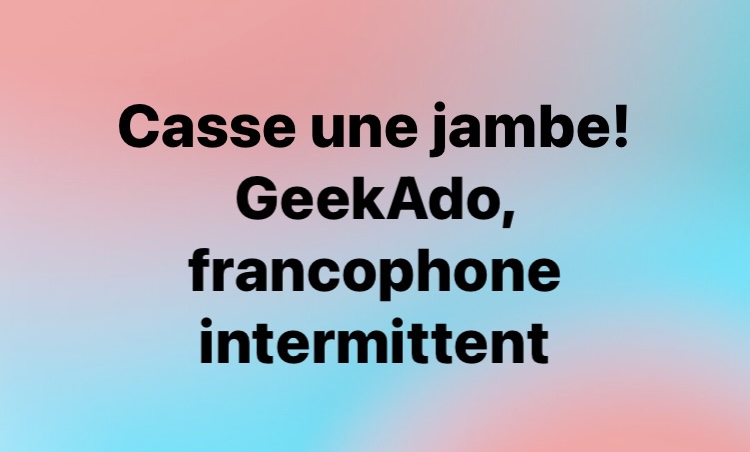 Ça n’a ni boulversé ni surpris sa soeur, elle l’a même remercié puisque GeekAdo, contrairement aux apparences, ne lui voulait aucun mal. Je sens que ce n’est pas clair. C’est à dire que GeekAdo, qui pourtant a fait de gros progrès en français, a traduit littéralement. En anglais, pour souhaiter bonne chance à quelqu’un, on dit « break a leg ». Ça ne veut pas dire qu’on souhaite qu’il se détruise vraiment la jambe. Après, je reconnais que c’est surprenant et ça ne se dit pas du tout en français.