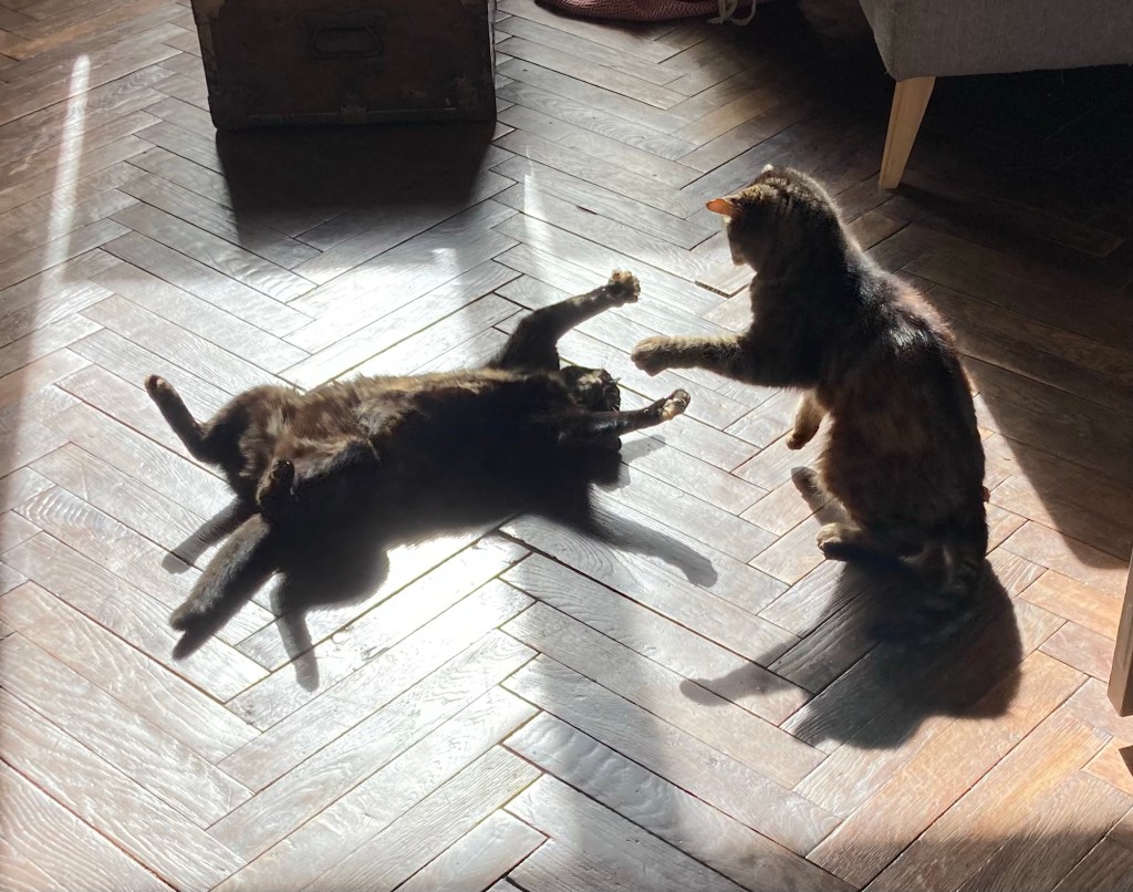Marcel a profité d’un rayon de soleil sur le parquet pour tenter de jouer avec Capucine. Ça a été un échec.