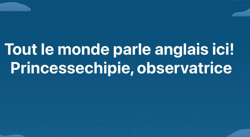 Elle était absolument ravie de se retrouver dans le monde linguistique dans lequel elle a grandi, et elle nous a bien sûr téléphoné en français, y compris à sa sœur alors qu’elles ne se parlent qu’en anglais entre elles à la maison. Bref, Princessechipie a repris spontanément ses anciennes habitudes linguistiques et elle a adoré: l’anglais dehors, le français avec la famille (et les amis cette fois). Bon, depuis, après deux jours à faire interprète 24/7, elle commence à saturer un peu.
