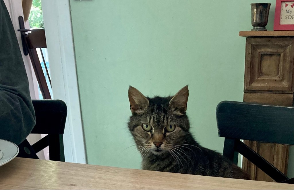 Capucine a pris sur elle de se mettre à table, comme les humains, et pourquoi on ne lui donne pas une assiette, hum?