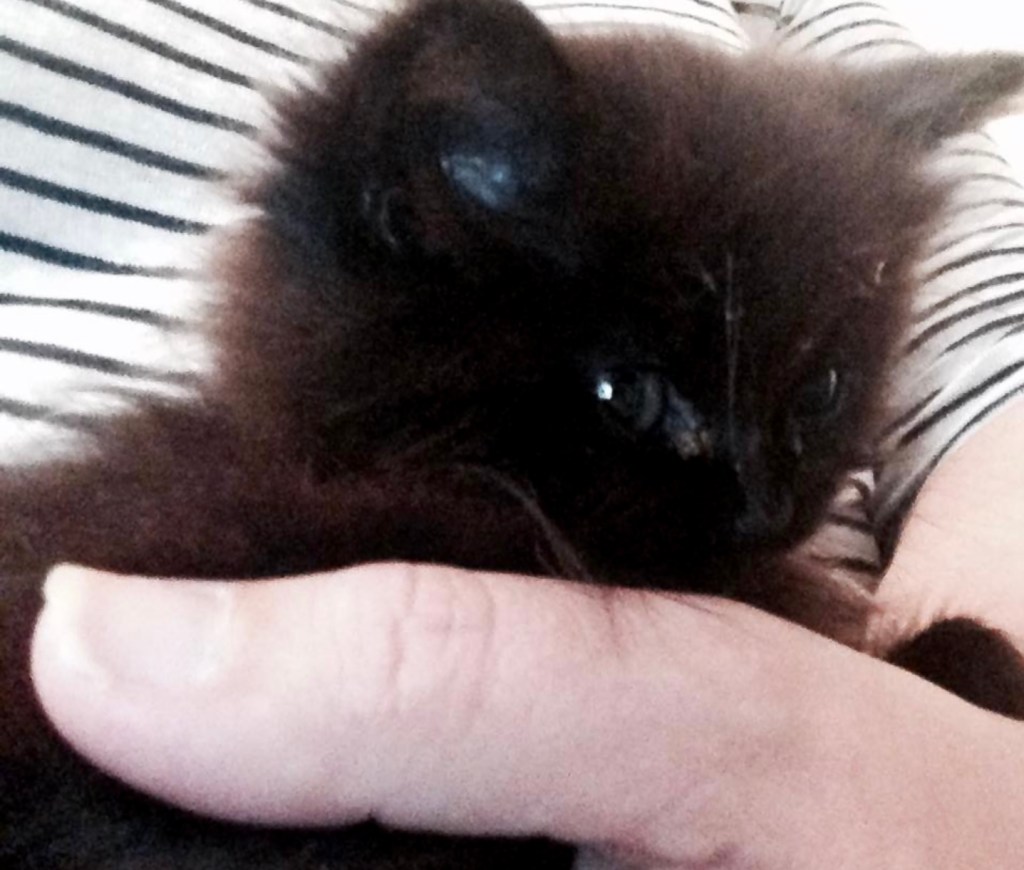 On l’a récupérée dans un élevage, même sa mère n’en voulait pas tellement elle était rachtoque et déjà défectueuse. Sans nous, ils s’en débarrassaient. Elle n’avait que 5 semaines, elle ne savait pas se laver ni manger toute seule. Elle n’a jamais su se laver d’ailleurs. Certes, elle était très petite comparée aux autres chatons, mais on pouvait encore croire qu’elle n’était pas aussi empotée qu’elle s’est avérée l’être par la suite. On pensait qu’elle allait apprendre, que c’était normal pour un bébé chat (même si Capucine qu’on a eu très jeune aussi, n’a jamais été comme ça).
