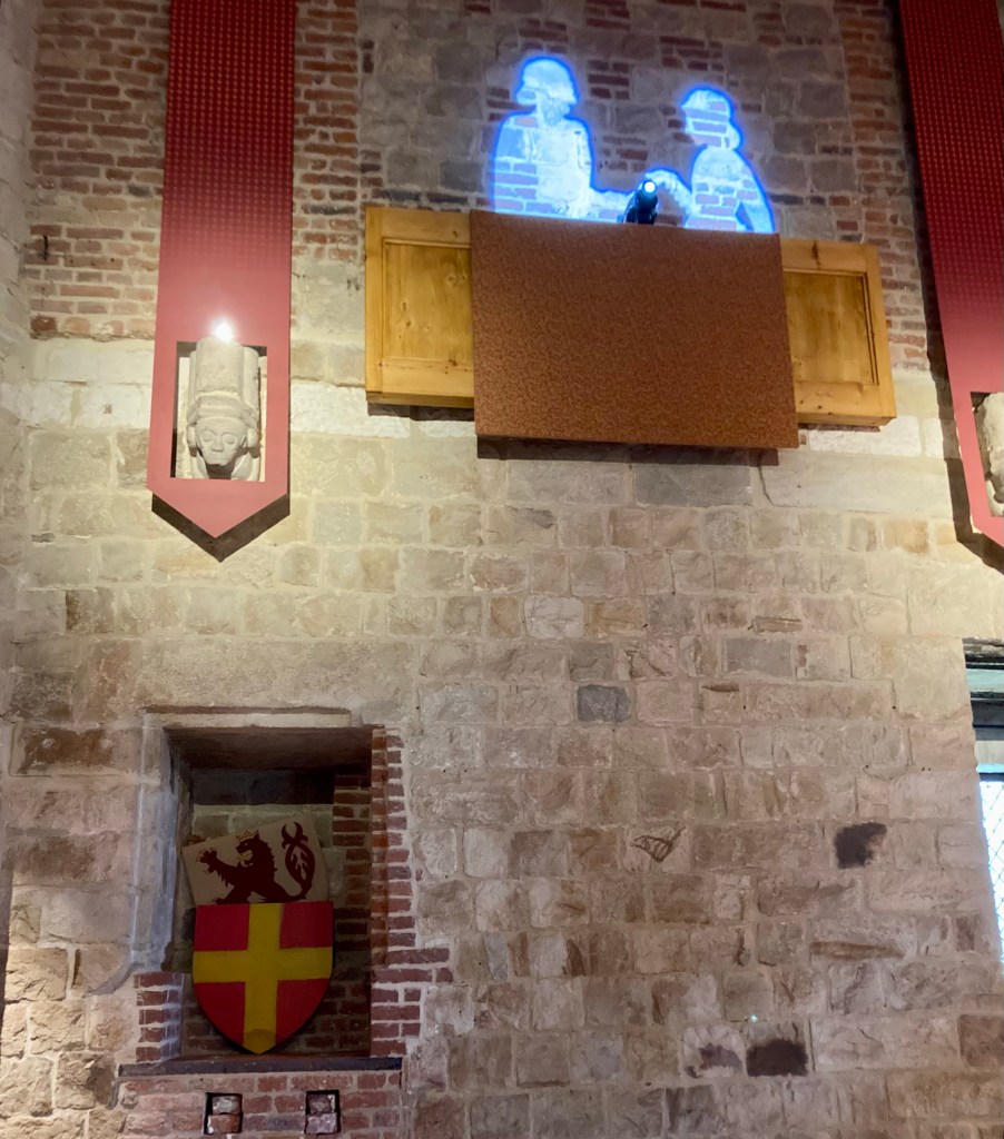 L’intérieur a été très bien restauré, juste comme il faut. On visite le cellier, où Princessechipie s’est extasiée sur la fabrication des fromages au moyen âge , la grande et haute salle d’apparat, où Wizzboy a pu trôner fièrement dans le siège du seigneur, et les salles privées à l’étage, avec tout un tas d’escaliers très abrupts et étroits, coincés dans les murs, des tourelles…et des latrines, pour la plus grande joie de mes deux gamins, ça fait plaisir de les sortir! La mise en scène est très bien faite, la vie des habitants du donjon est suggérée, sans en faire trop, et la guide est très patiente ( parce que oui, Wizzboy et Princessechipie ont tenu à faire semblant d’utiliser les latrines. Et oui, on a fait semblant de ne pas les connaître, mais vu qu’on était 5 pour la visite, ça a raté).