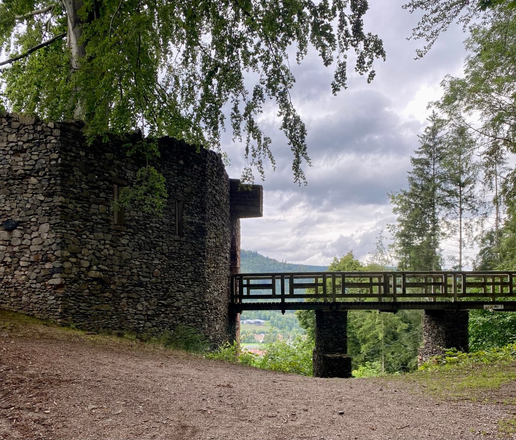 Le château de Schirmeck date du treizième siècle mais il a été en partie détruit pas les suédois en 1633, pendant la guerre de 30 ans et n’a plus jamais été occupé. On voit bien que le donjon a accueilli un musée fermé depuis longtemps, mais ce qu’il reste du château est encore assez impressionnant. Et effectivement, la vue est magnifique.