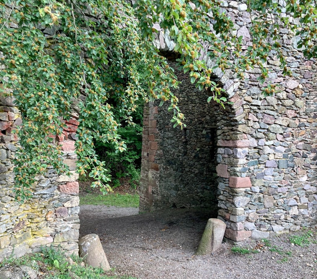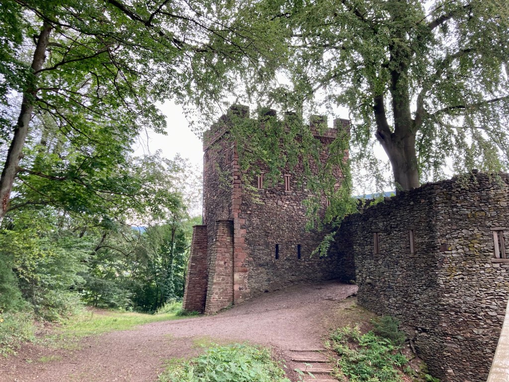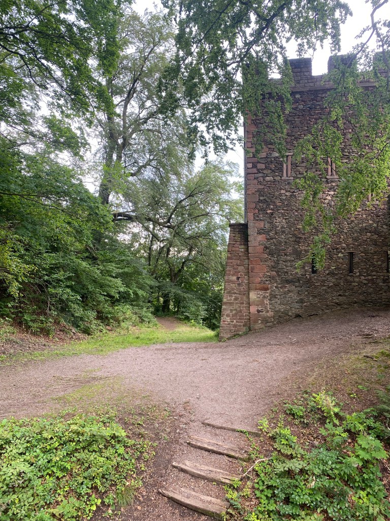 Finalement, malgré notre sens de l’orientation défectueux, on a réussi à tomber par hasard sur le bon chemin. Alors soyons clair, il est très accessible, ce sentier, et même pas si long que ça. Mais il est très étroit et surtout, il monte. Si. C’est à dire que pendant que Princessechipie et Wizzboy gambadaient joyeusement devant, Maricheri m’a péniblement remorqué: non je n’ouvrirai pas les yeux, il y a le viiiiide là, à côté de mon piiiiiied. Rhaa. Bref j’ai le vertige. Mais la montée en vaut la peine, le château est charmant et non je ne m’ approcherai pas plus du bord de la muraille pour mieux admirer le paysage.